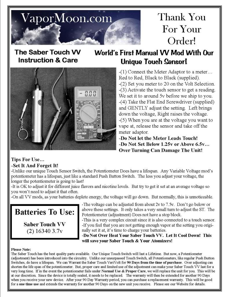 I've just about reached my limit to taking special orders for it before the release. Maybe just a couple more. And don't forget, you can download the 2 page instructions at post #4603 on this thread. This will give you a really good idea about the VV. And remember, you do get the Key Chain Screwdriver, and the Meter Attachment, plus it's wrapped in a Polishing Cloth! I don't charge extra for the things necessary to use a VV Mod, like some others do!